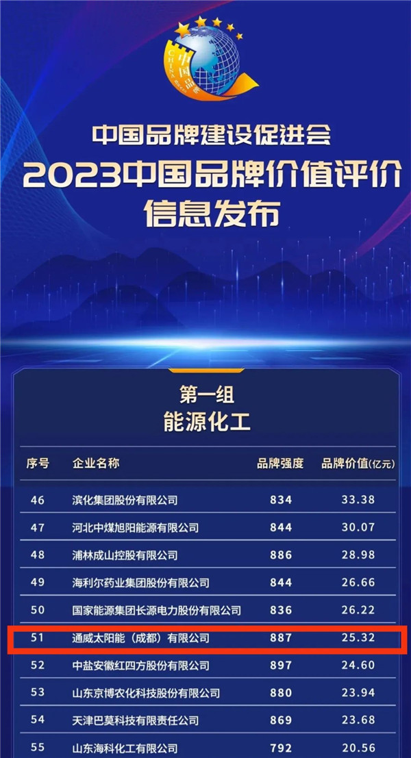 通威太陽能雙流基地位列2023中國品牌價值評價“能源化工”組榜單第51位