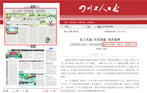 《四川工人日報》聚焦通威太陽能眉山基地榮獲“四川省五一勞動獎狀”