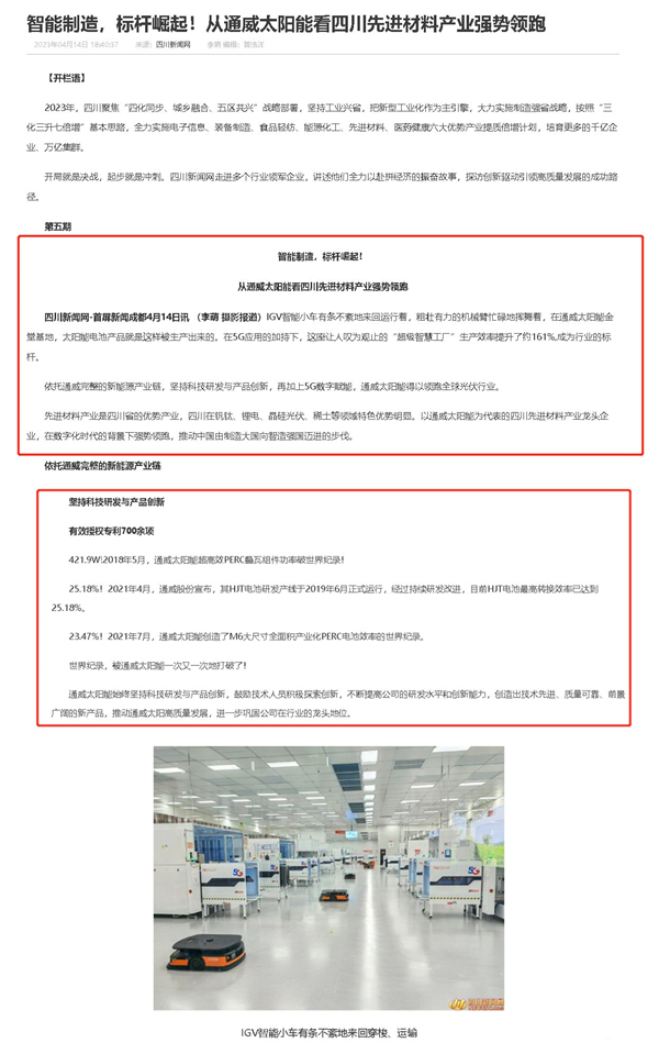 近日,四川新聞網(wǎng)以《智能制造,標(biāo)桿崛起!從通威太陽(yáng)能看四川先進(jìn)材料產(chǎn)業(yè)強(qiáng)勢(shì)領(lǐng)跑》為題,聚焦通威太陽(yáng)能智能制造產(chǎn)業(yè)蓬勃發(fā)展。