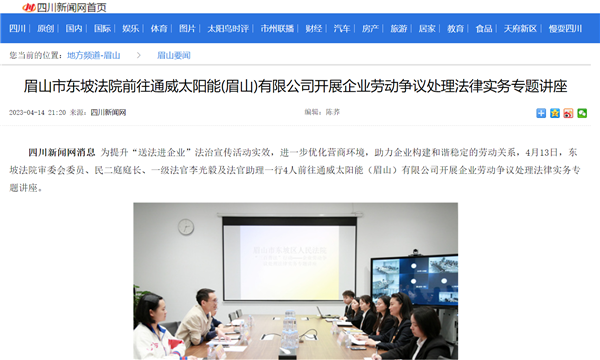 近日,四川新聞網發布一篇題為《眉山市東坡法院前往通威太陽能(眉山)有限公司開展企業勞動爭議處理法律實務專題講座》的專題報道,聚焦通威太陽能眉山基地企業勞動爭議處理法律實務專題講座。
