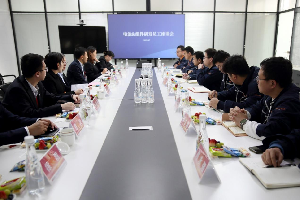當(dāng)日,邢博一行先在合肥高效項目組參加例行早會,后來到疊瓦組件聽取工作匯報,并參加光伏技術(shù)部周會,最后同高效電池&組件研發(fā)部展開座談交流,詳細(xì)了解了高效電池部和組件研發(fā)部相關(guān)技術(shù)改善工作。