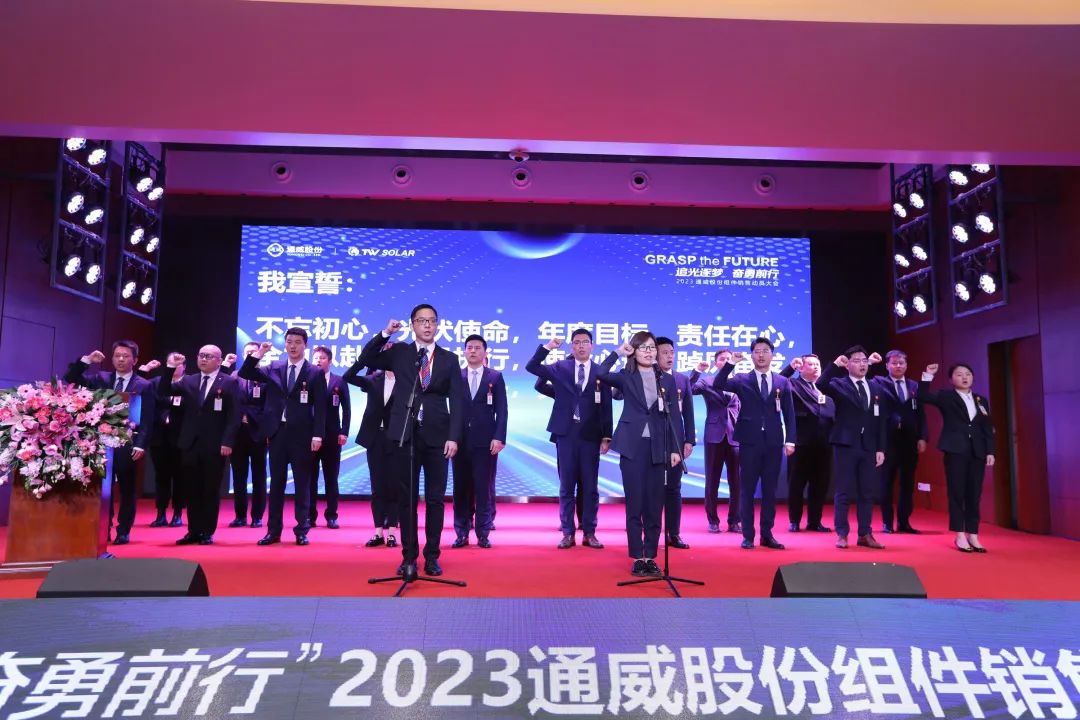 3月28日,以“追光逐夢 奮勇前行”為主題的通威股份2023組件銷售動員大會在通威國際中心如期舉行。全國人大代表、全國工商聯副主席、通威集團董事局劉漢元主席,通威股份董事長、CEO劉舒琪出席并作重要指示。通威股份總部各部門主要負責人、光伏技術中心核心團隊、組件生產及營銷團隊等干部員工全程參與。