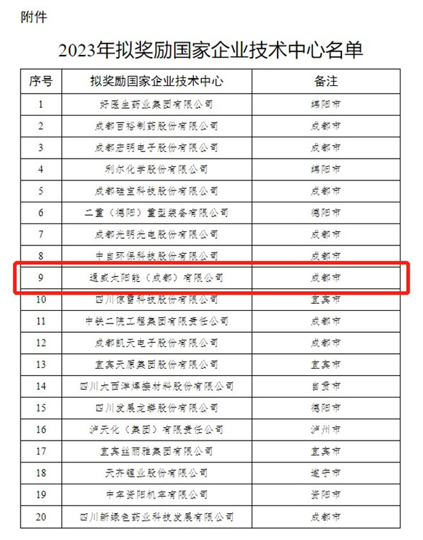 3月20日,四川省發(fā)改委公示了2023年擬獎(jiǎng)勵(lì)國(guó)家企業(yè)技術(shù)中心名單,通威太陽(yáng)能雙流基地國(guó)家企業(yè)技術(shù)中心榮列其中。