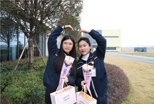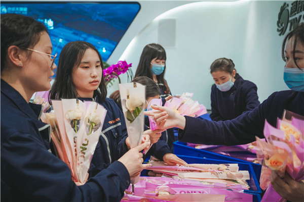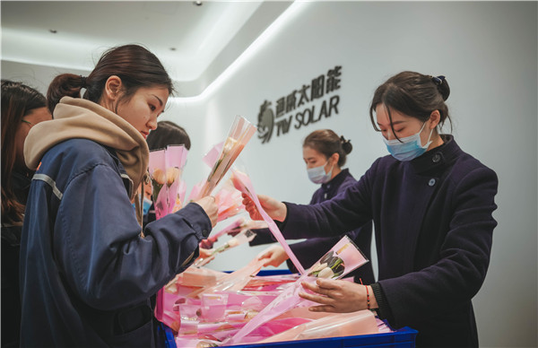福利派送活動現場,工會載著滿滿一車鮮花和禮物駐足等待,為到場的女職工送上節日的祝福,祝愿各位“女神”越來越美麗、越來越順利。嬌艷的鮮花,精美的禮盒,暖心的話語,表達著通威太陽能工會對女職工的尊重與感謝。大家捧著溫馨精致的禮盒,沉浸在一片溫情愉快的節日氛圍中,紛紛感謝公司的誠摯慰問,并表示將積極投身到工作之中,為公司的發展添磚加瓦,展示巾幗之風。