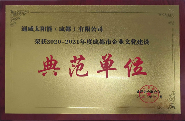本次評選活動由成都企業聯合會主辦。成都企業聯合會是經成都市人民政府批準,由成都市經濟和信息化委員會主管,經成都市民政局核準登記的社團法人,評選活動每兩年舉辦一次。本次評選中,通威太陽能精心準備,通過詳實的材料全面生動地展示了公司企業文化建設取得的豐碩成果,最終從眾多參評企業中脫穎而出,榮膺“2020-2021年度成都市企業文化建設典范單位”。