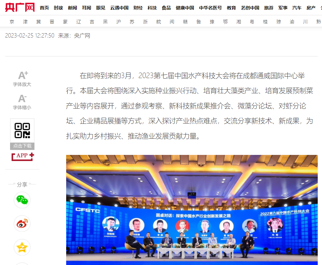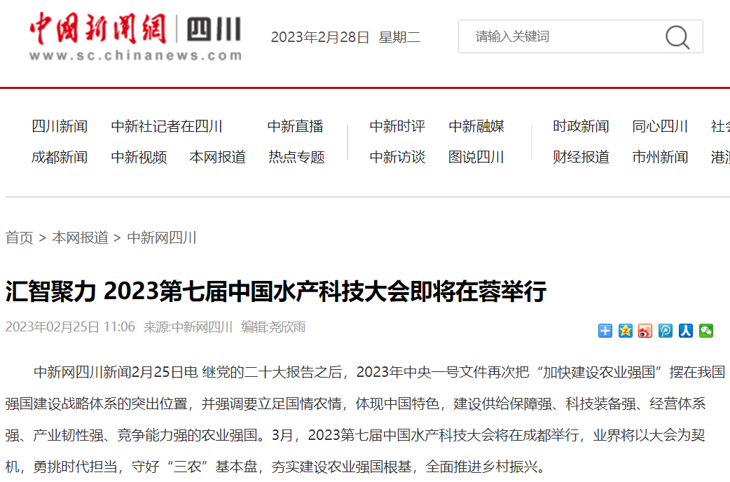 2月16日,人民網以《2023第七屆中國水產科技大會將于3月舉行》為題聚焦大會。報道指出,本屆大會將邀請相關院士專家,深度解讀水產行業發展趨勢;通過新科技新成果推介會、微藻分論壇、對蝦分論壇等的舉辦,交流分享新技術、新成果,為扎實推動鄉村振興、漁業振興做出積極努力。