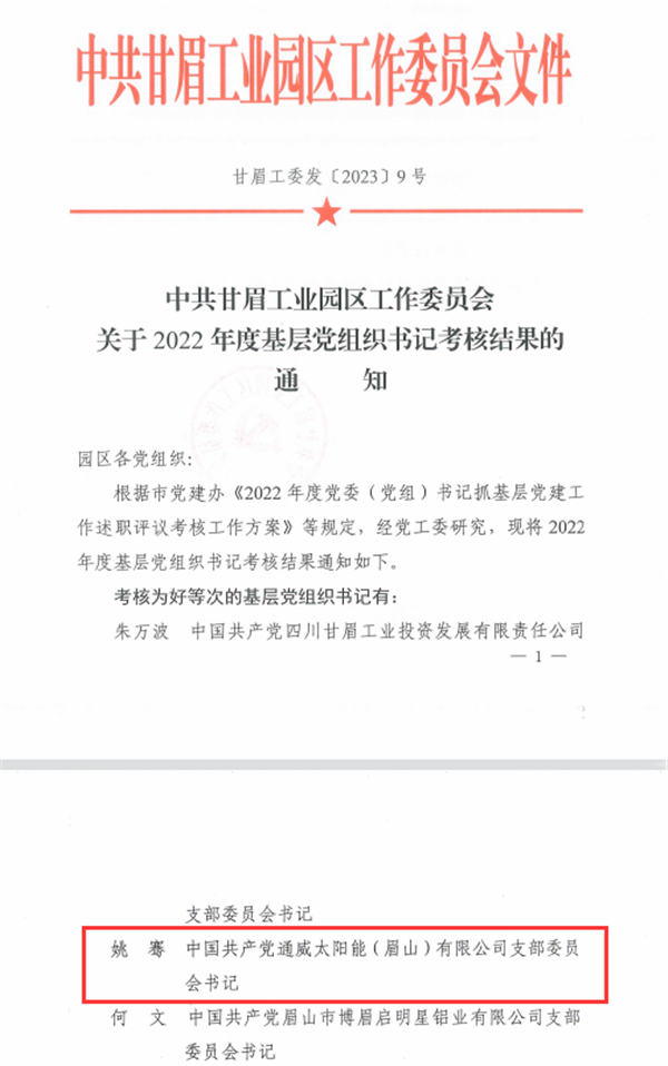 近日,通威太陽(yáng)能眉山基地黨支部書(shū)記、總經(jīng)理助理姚騫被評(píng)為“2022年度甘眉工業(yè)園區(qū)優(yōu)秀基層黨組織書(shū)記”,對(duì)其過(guò)去一年在黨建發(fā)展、團(tuán)隊(duì)管理所付出的努力與取得成果給予認(rèn)可與肯定。