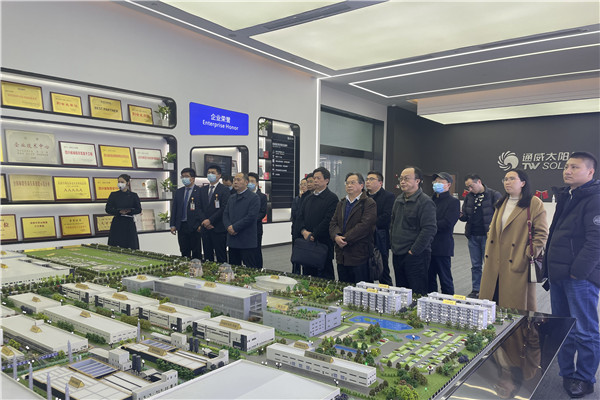李軼巡視員一行首先參觀了通威太陽能展廳及智能制造車間,詳細了解了公司的發展歷程、未來規劃、企業榮譽及公司在光伏領域的發展情況,并對通威太陽能的智能制造模式以及“碳中和”的發展理念給出高度的評價。