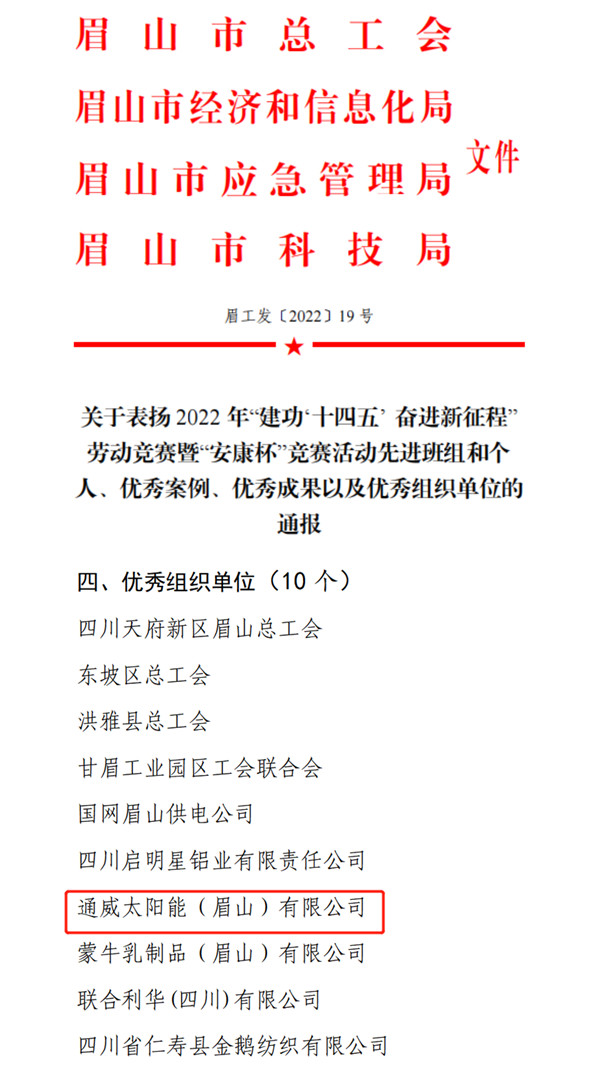 為樹立榜樣, 激勵先進,近日,眉山市總工會通報表揚了2022 年“建功‘十四五’奮進新征程”勞動競賽暨“安康杯”競賽活動節能減排先進班組和個人、安全風險隱患排查整治優秀案例、五小創新優秀成果及10家眉山市優秀組織單位,通威太陽能眉山基地均榮列其中。