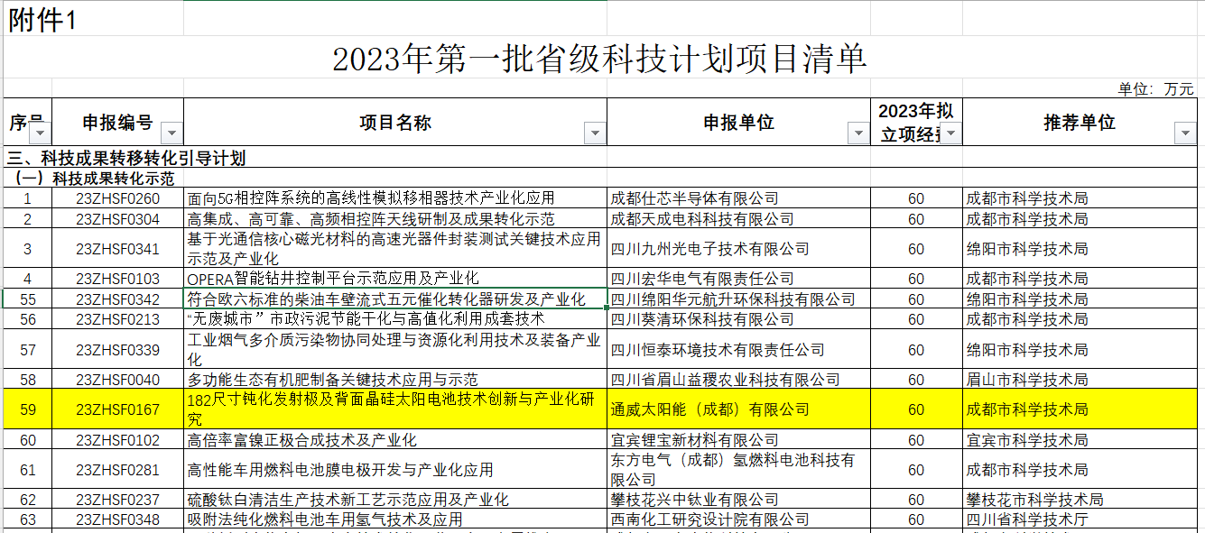 近日,四川省科技廳發布了《2023年第一批省級科技計劃項目清單》,通威太陽能雙流基地“182尺寸鈍化發射極及背面晶硅太陽電池技術創新與產業化研究”成功入列該名單。
