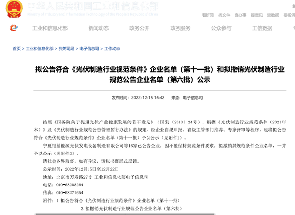 12月22日,國家工業(yè)和信息化部網(wǎng)站對擬公告符合《光伏制造行業(yè)規(guī)范條件》企業(yè)名單(第十一批)完成公示,此次全國共遴選22家企業(yè)入圍名單,通威太陽能眉山基地作為四川省唯一入列企業(yè),成功入選“光伏制造業(yè)規(guī)范條件”企業(yè)公示名單。