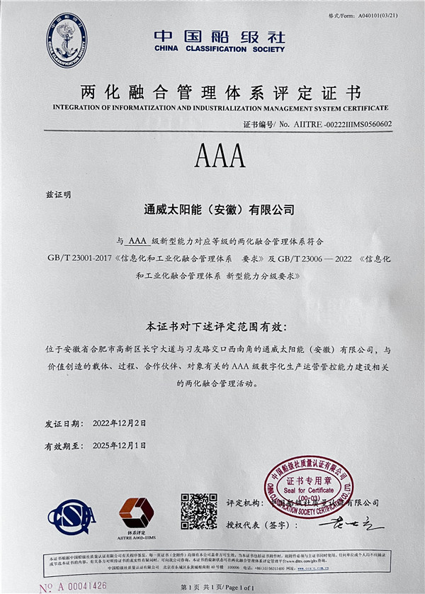 近日,通威太陽能(安徽)有限公司順利通過國家工信部信息化與工業化融合(簡稱“兩化融合”)管理體系貫標評定,并于12月20日取得兩化融合管理體系評定AAA證書。