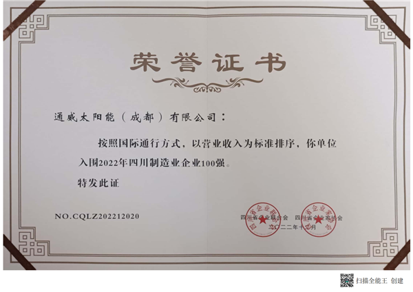 “2022年四川制造業百強企業”榜單是四川省企業聯合會按照國際通行辦法,以2021年營業收入為標準,經有關機構審定,發布百強企業榜單。本次獲獎是通威太陽能雙流基地連續四年榮登榜單,是對企業產品競爭力的極大肯定,是公司踐行高質量發展,加快培育發展新動能,扎實做強做優爭創一流的體現,亦是企業主動承擔社會責任,積極助力雙碳目標實現的決心和實力的彰顯。
