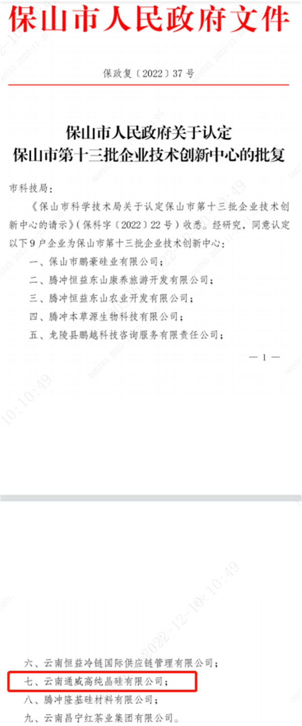 熱烈祝賀云南通威榮獲“保山市企業技術創新中心”稱號