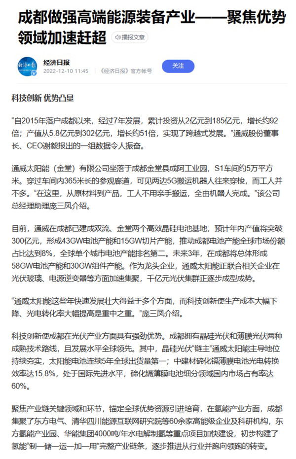 12月10日,《經(jīng)濟日報》以“成都做強高端能源裝備產(chǎn)業(yè)——聚焦優(yōu)勢領(lǐng)域加速趕超”為題,聚焦報道通威太陽能金堂基地在科技創(chuàng)新方面的亮眼表現(xiàn)。