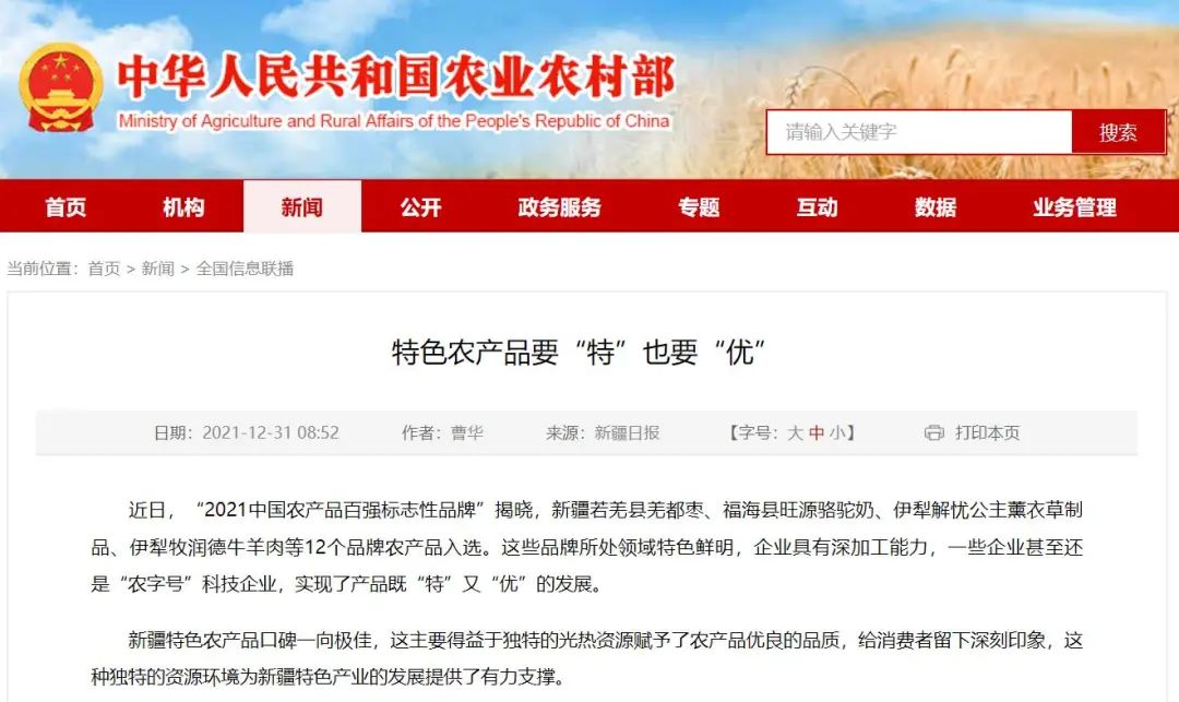 農(nóng)業(yè)農(nóng)村部官方網(wǎng)站轉(zhuǎn)載“2021中國農(nóng)產(chǎn)品百強標(biāo)志性品牌”相關(guān)信息
