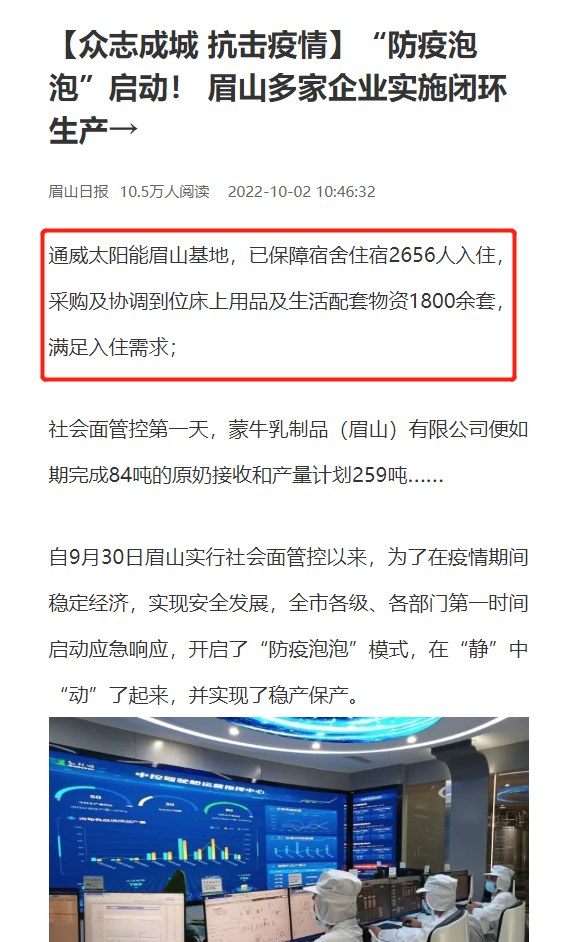 近日,《眉山日報》發表題為“眾志成城 抗擊疫情‘防疫泡泡’啟動! 眉山多家企業實施閉環生產”的報道,在報道中聚焦通威太陽能眉山基地積極防疫與閉環生產。