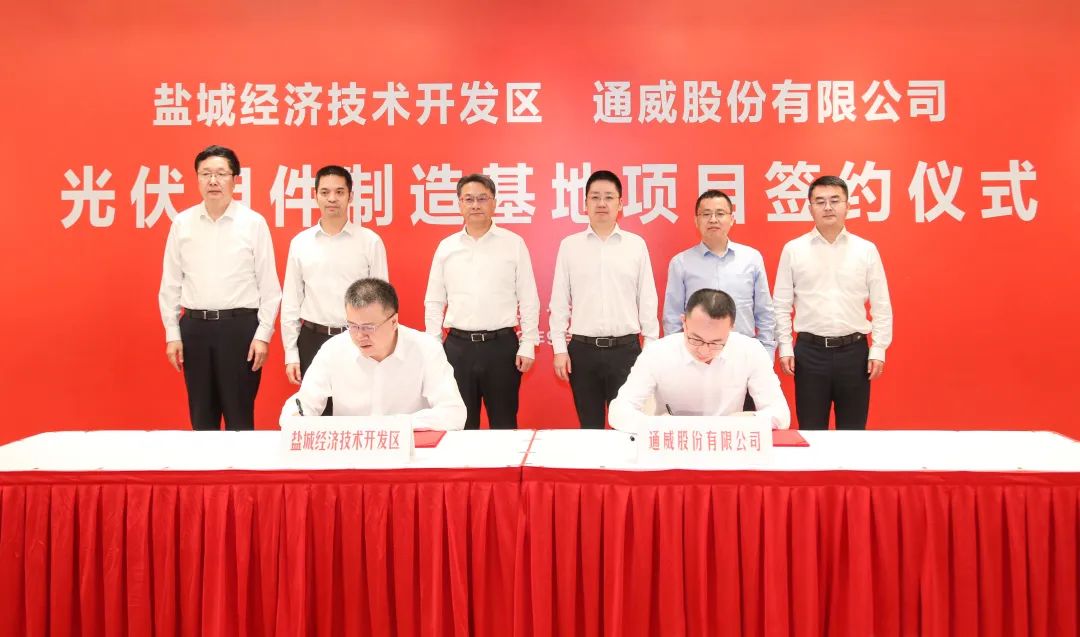 9月29日,通威股份高效光伏組件制造基地項目簽約活動在江蘇鹽城圓滿舉行。鹽城市委書記徐纓會見通威股份董事長、CEO謝毅一行,鹽城市委副書記、市長周斌,副市長唐敬、市有關部門和鹽城經濟技術開發區主要負責人參與簽約活動并共同見證。