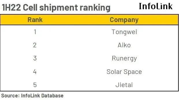 7月29日,咨詢機構PV InfoLink公布了最新2022年上半年全球電池片出貨排名,通威股份位居榜首。圖源:InfoLink