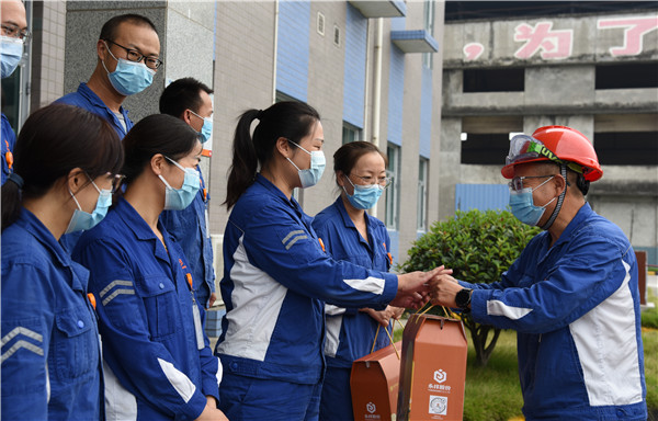 杜總先后來(lái)到中控樓、機(jī)修車間、液氯充裝、乙炔車間,每到一處,將中秋禮包分發(fā)到現(xiàn)場(chǎng)每一位員工的手中,并代表通威股份副總裁、永祥股份總經(jīng)理李斌向大家提前致以節(jié)日的祝福和問(wèn)候,對(duì)員工的辛勤付出和家屬的默默支持表示感謝。慰問(wèn)現(xiàn)場(chǎng)氣氛熱烈,員工們的喜悅之情溢于言表,手里拎著精美的節(jié)日禮包,臉上流露出開心的笑容,沉甸甸的節(jié)日福利給員工們帶來(lái)了歡笑和感動(dòng)。