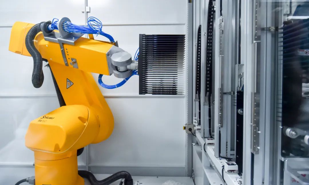 ▲通威太陽能智能制造生產(chǎn)線上,機(jī)械臂快速轉(zhuǎn)運(yùn)電池片