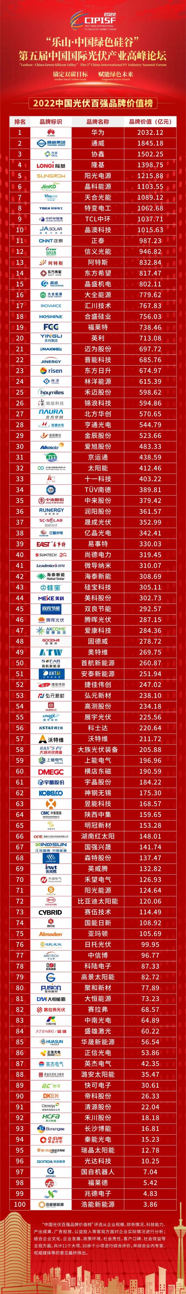 8月26日,以“錨定雙碳目標 賦能綠色未來”為主題的2022第五屆中國國際光伏產業高峰論壇在成都通威國際中心隆重舉行,來自中央、省、市各級政府及行業協會重要領導、行業專家、領袖企業家以及企業精英匯聚一堂,聚焦“雙碳”背景下,光伏品牌的新作為、新發展。作為重磅環節,當天大會上“金辰杯”CIPISF2022中國光伏百強品牌價值榜隆重揭曉,華為、通威、協鑫、隆基、陽光電源、晶科能源、天合光能、特變電工、TCL中環、晶澳科技等100個全國知名光伏行業品牌榮列榜單。