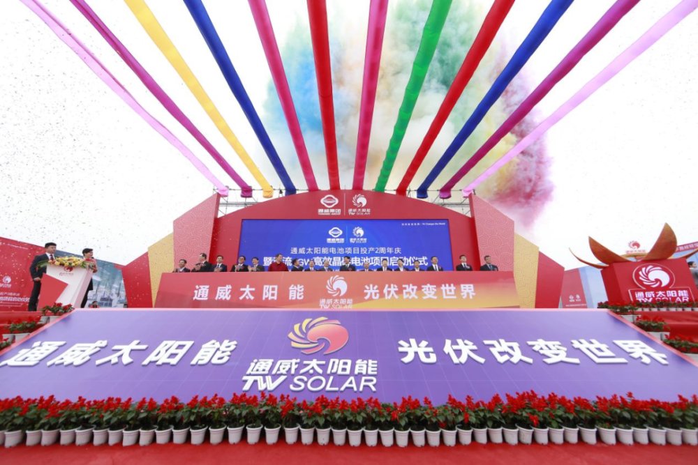 ▲2015年11月18日,通威電池項目投產2周年慶暨雙流5GW高效晶硅電池項目啟動儀式現場