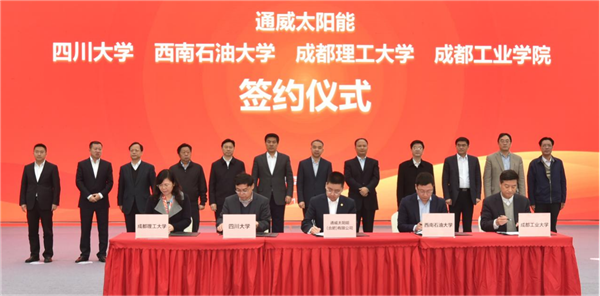 ▲2017年11月18日,通威太陽能與四川大學(xué)、西南石油大學(xué)、成都理工大學(xué)、成都工業(yè)學(xué)院簽訂《校企合作協(xié)議》