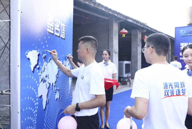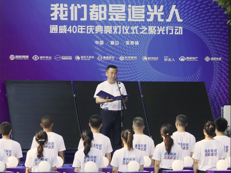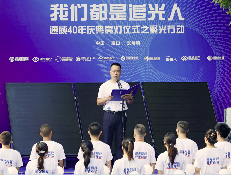 在現場所有人的共同見證下,劉老太爺按下按鈕,啟動通威太陽能發電裝置,吸收通威起源地的清晨第一縷陽光,通過現場的小型太陽能離網式光伏發電裝置實時發出的清潔電力,聚起通威40年慶典的第一束光,并點亮代表通威各產業、各板塊的40盞聚光燈,正式拉開通威40年慶典亮燈儀式的序幕。