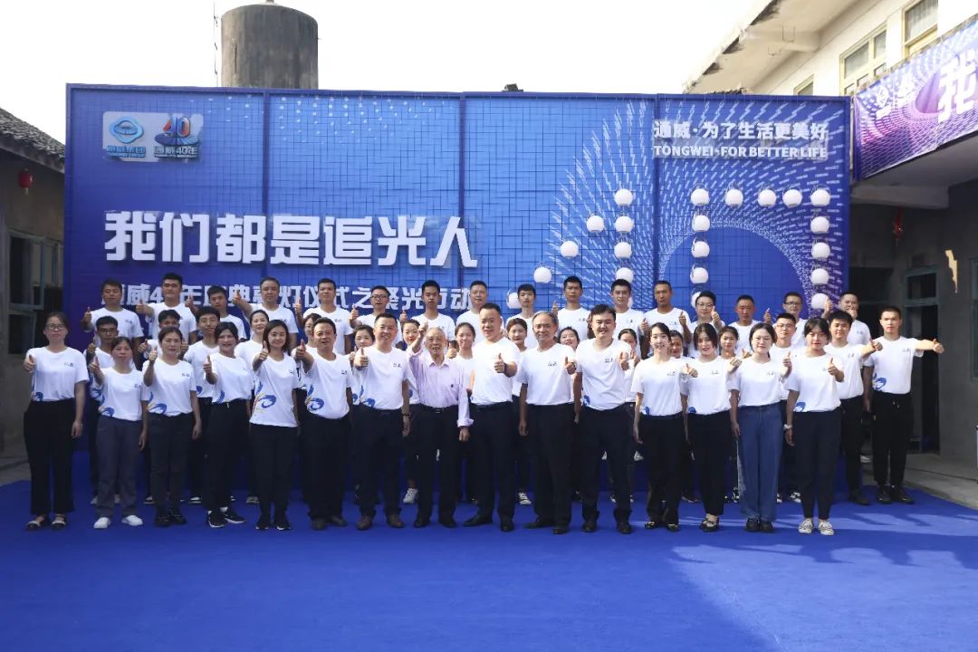 四十年前,在眉山市永壽鎮蟆頤堰,伴隨著改革春風,通威悄然誕生。就在這條小河旁,通威種下了奮斗的火種。8月20日,在通威40年慶進入倒計時1個月之際,40年慶典晚會重磅預熱活動——“我們都是追光人”通威40年慶典亮燈儀式之聚光行動,在這里隆重舉行,通過通威太陽能發電裝置,吸收通威起源地清晨的第一縷陽光,實時發出清潔電力,聚起通威40年慶典的第一束光。劉老太爺,老一輩通威人代表聶良、劉漢平,通威太陽能總經理周華,通威農發華西一區總經理、四川通威總經理彭金鋼出席活動,以及來自通威各產業、各板塊的40位追光代表共同見證歷史性的一刻。