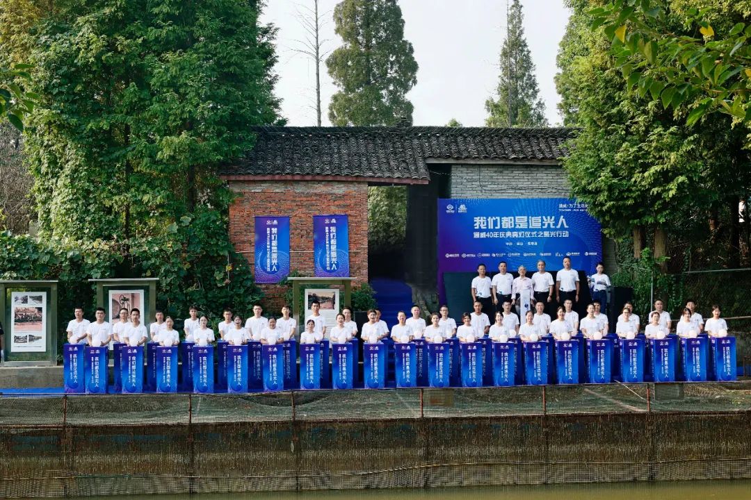 在蟆頤堰試驗“渠道金屬網箱式流水養魚”技術的原址,當天格外熱鬧。小河雖然同往日一樣,靜靜地流淌著,但卻讓現場的每一個人都心潮澎湃。只見代表通威各產業、各板塊的40盞聚光燈已經整齊排放,40位追光代表也已經就位,他們將帶著從夢想開始的地方匯聚而來的光,追光逐夢,向著未來再出發。