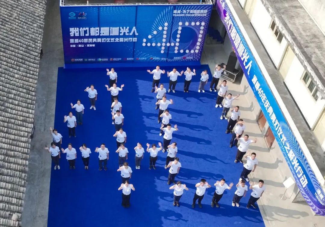 隨后,40位追光代表拎著聚光燈,有序地跑向通威前身眉山縣漁用配合飼料廠。這是劉漢元主席自行設計、自行施工、自行安裝建起的第一家工廠,也是西南地區第一家集約化魚飼料廠,見證了通威的第一次轉型開拓。在眉山縣漁用配合飼料廠原址,40位追光代表依次將聚光燈掛在背景裝置上,用光點匯聚起“通威之光”。