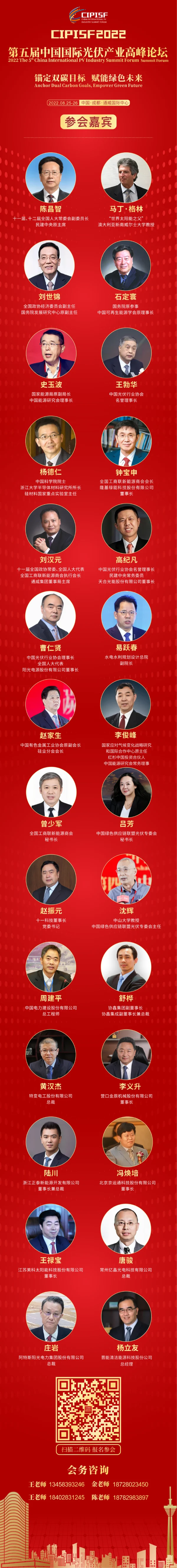 隨著各項籌備工作的穩步推進,本屆論壇再添一批重磅嘉賓:十一屆、十二屆全國人大常委會副委員長、民建中央原主席陳昌智,全國政協經濟委員會副主任、國務院發展研究中心原副主任劉世錦,國家能源局原副局長、中國能源研究會理事長史玉波,全國工商聯新能源商會會長、隆基綠能科技股份有限公司董事長鐘寶申,十一屆全國政協常委、全國人大代表、全國工商聯新能源商會執行會長、通威集團董事局劉漢元主席,中國光伏行業協會名譽理事長、民建中央常務委員、天合光能股份有限公司董事長高紀凡,中國光伏行業協會理事長、全國人大代表、陽光電源股份有限公司董事長曹仁賢,水電水利規劃設計總院副院長易躍春,國家應對氣候變化戰略研究和國際合作中心原主任、紅杉中國投資合伙人、中國能源研究會常務理事李俊峰,全國工商聯新能源商會秘書長曾少軍將悉數出席。