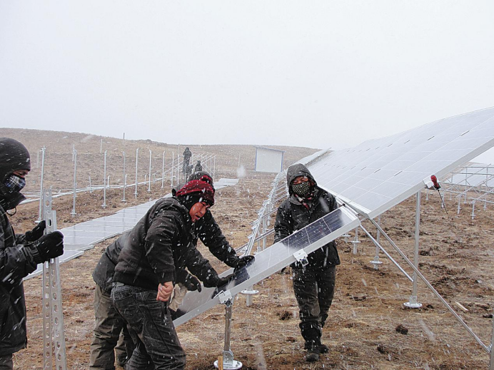 ▲理塘縣若拉村,通威項目組建設人員頂著風雪安裝光伏板