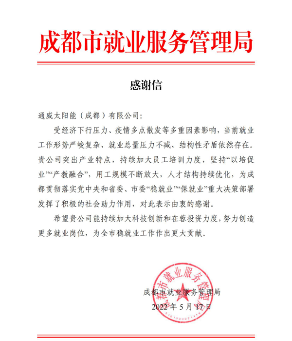 ▲2022年5月18日,成都市就業(yè)服務(wù)管理局向通威太陽能(成都)有限公司寄來的感謝信