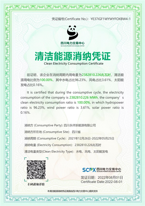 憑證用中英文說明:永祥新能源在2021年12月26日至2022年5月25日的消納周期內(nèi),用電量為2382810.226兆瓦時(shí),清潔能源用電比例為100.00%,其中水電占比96.23%,風(fēng)電占比3.61%,太陽能發(fā)電占比0.16%。