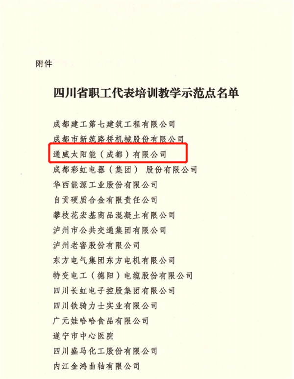 通威太陽能雙流基地榮列省職工代表培訓教學示范點名單