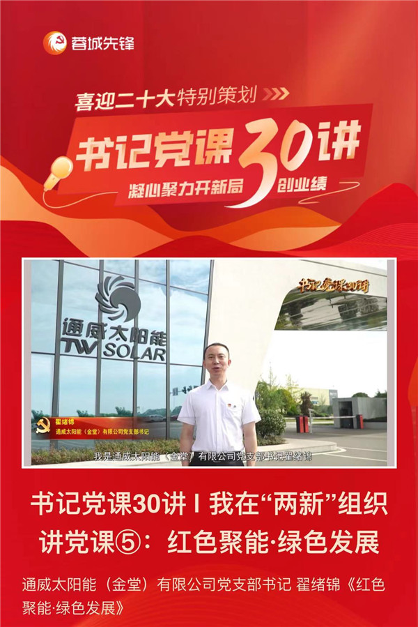 為深入學習宣傳貫徹四川省第十二次黨代會、成都市第十四次黨代會精神,加強基層黨組織書記隊伍建設,中共成都市委組織部開展了“書記黨課30講”展播活動,在全市農村、社區、國企、高校、中小學校、公立醫院、“兩新”組織等領域開展黨課宣講。通威太陽能金堂基地副總經理、黨支部書記翟緒錦作為“兩新”組織代表,以《我在“兩新”組織講黨課—紅色聚能 綠色發展》為主題作黨課宣講,并于7月26日在蓉城先鋒融媒體平臺進行展播。