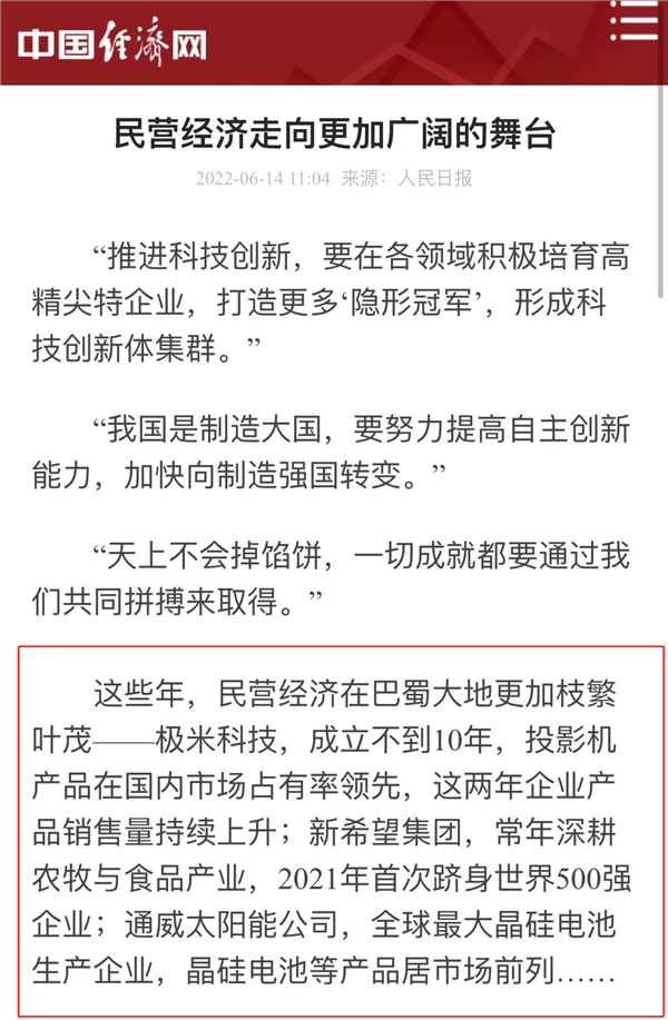 6月14日,人民網(wǎng)、人民資訊、中國經(jīng)濟(jì)網(wǎng)以“民營經(jīng)濟(jì)走向更加廣闊的舞臺(tái)”為題,聚焦通威太陽能助力地區(qū)經(jīng)濟(jì)發(fā)展。
