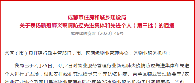 通宇物業(yè)獲成都市“新冠肺炎疫情防控先進(jìn)集體”通報(bào)表彰