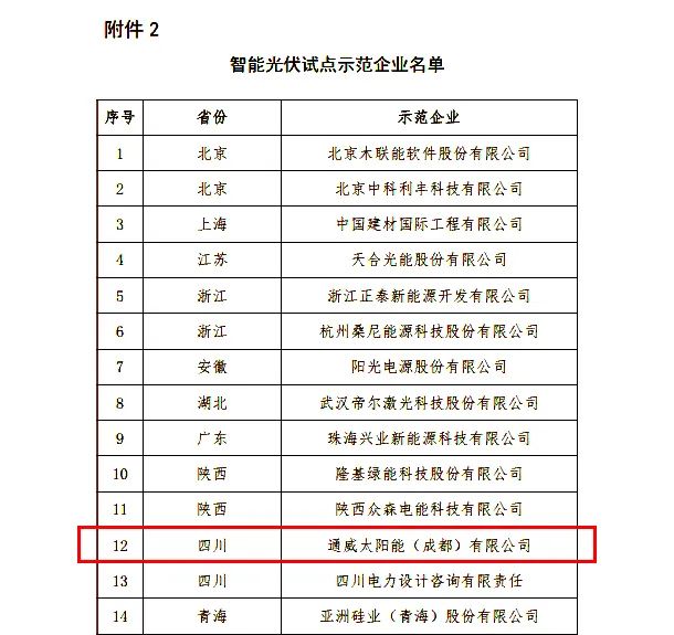 通威太陽能成都公司入列“智能光伏試點示范”名單