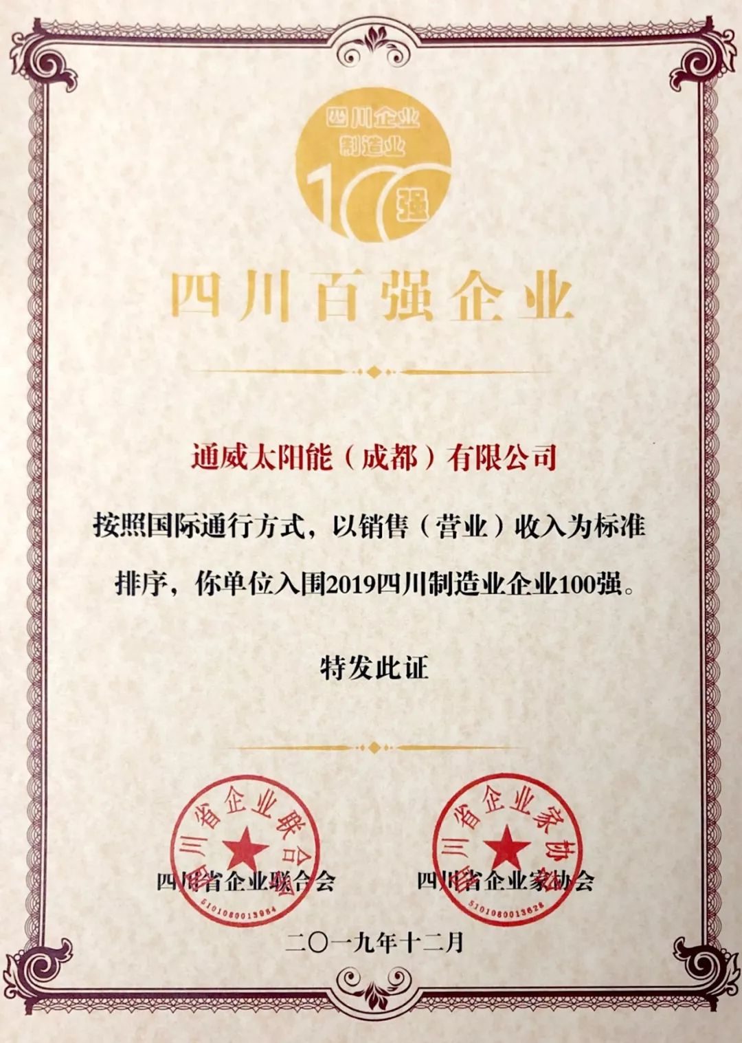 通威太陽能成都公司榮列“2019四川制造業企業100強”榜單
