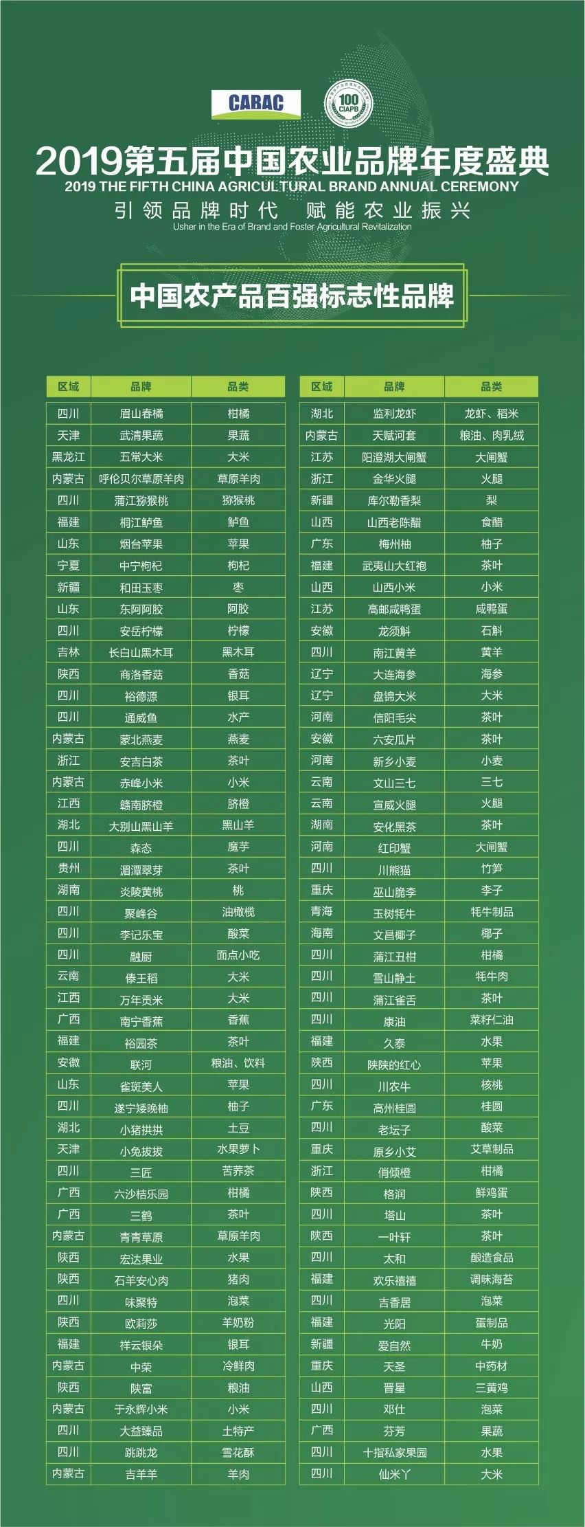 “中國農產品百強標志性品牌”及2019年度中國農業品牌獲獎名單