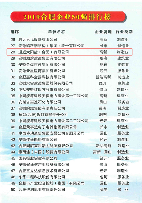 通威太陽能合肥公司 榮列合肥企業50強、合肥制造業企業30強榜單