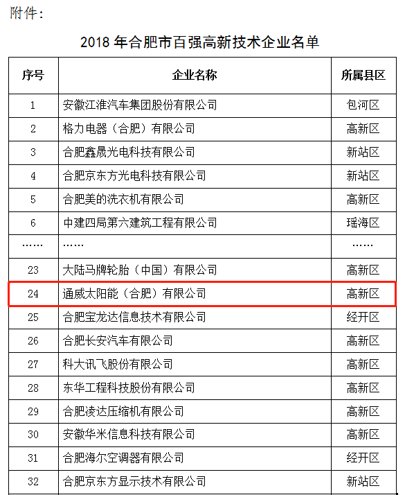 通威太陽能合肥公司入列2018年合肥市百強高新技術企業名單