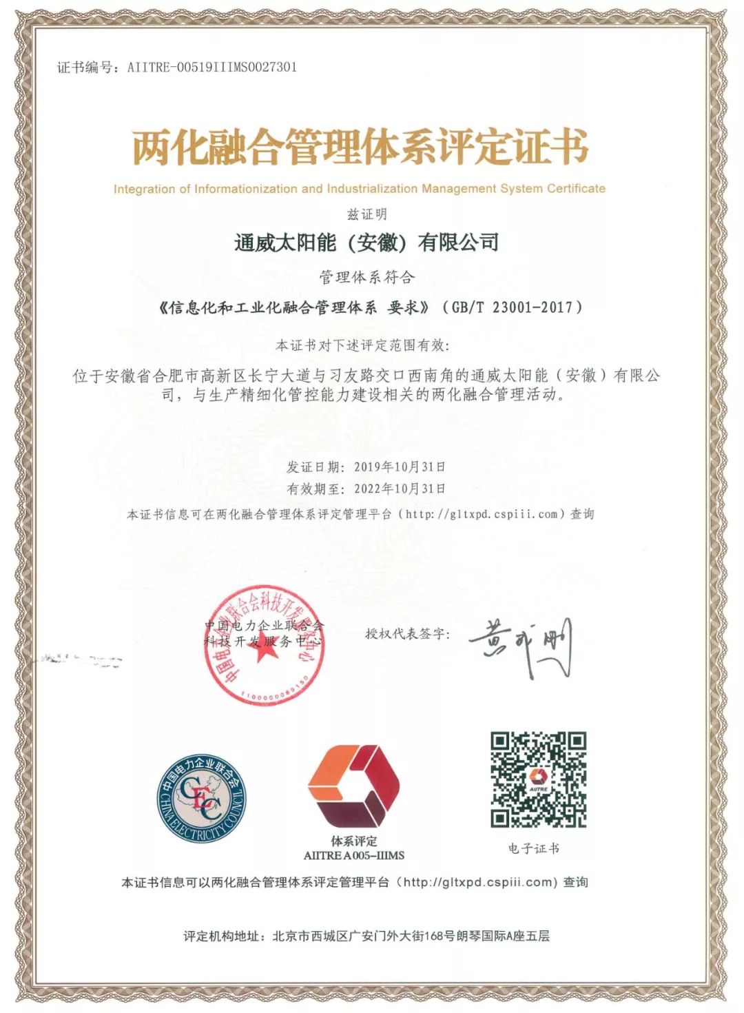 通威太陽能榮獲“兩化融合管理體系評定證書”