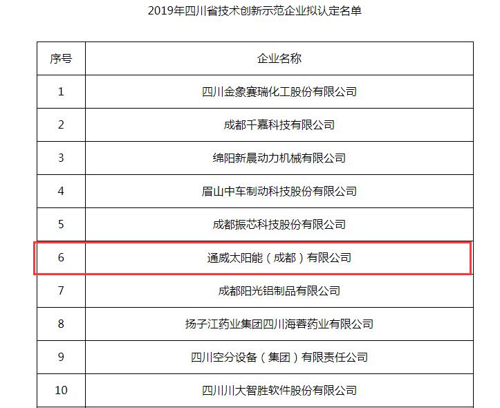 通威太陽能榮膺“2019年四川省技術創新示范企業”稱號
