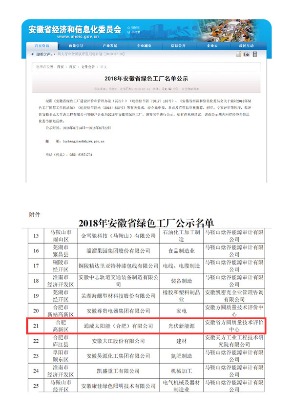 通威太陽能合肥公司榮列 “2018年安徽省綠色工廠”公示榜單