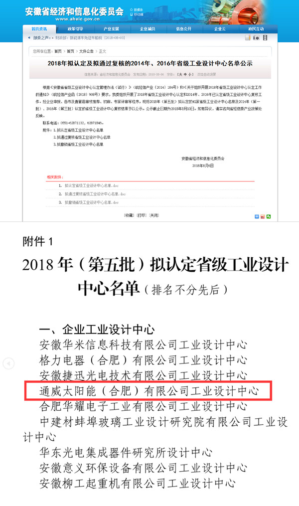 通威太陽能(合肥)有限公司榮列2018年擬認定省級工業設計中心公示名單