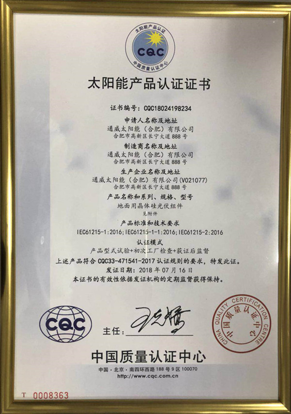 通威太陽能單晶疊瓦組件獲全球首張CQC新版IEC標準認證證書